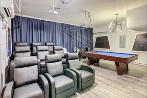 The garage game room includes a pool table and a 125-inch drop down projection screen, surround sound, and comfortable seating for 9 with air conditioning.